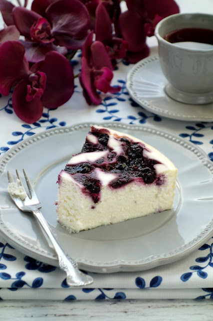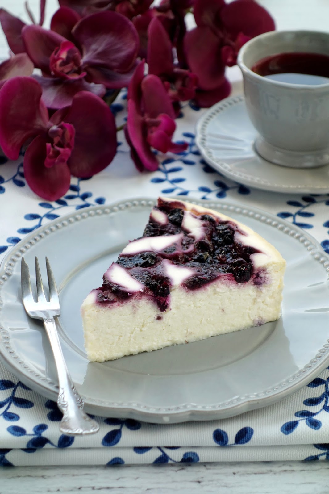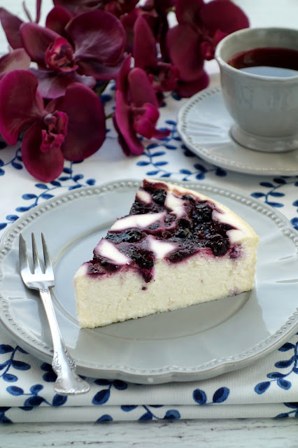 Pieczony w kąpieli wodnej dzięki czemu równo rośnie, nie opada i jest wilgotny oraz kuchy. Z dużą ilością frużeliny porzeczkowej lub zwykłego puree z czarnej porzeczki. Bardzo ładnie wygląda z fantazyjnymi wzorami. Im mniej wzorów tym sernik ładniej wygląda. Ja zdecydowałam się na dużą ilość czarnej porzeczki, nie patrząc na wygląd, ale na mocny kwaskowy smak. Sernik jest bardzo prosty i szybki w przygotowaniu. Polecam bardzo serdecznie.