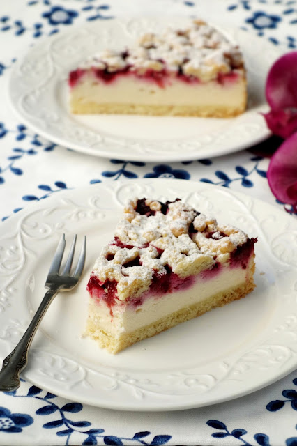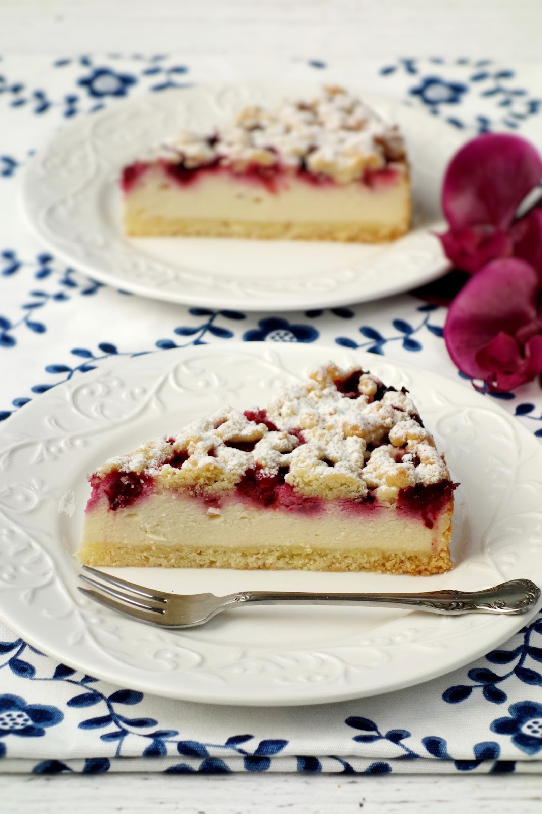 Połączenie sernika z kruchym ciastem i kwaśnymi owocami. Nie ma nic lepszego. Wszystkie warstwy czyli kruche ciasto, masę serową i kruszonkę umieszczamy w blaszce a następnie wstawiamy do piekarnika i czekamy, aż się upiecze. Bez wcześniejszego podpiekania pojedynczych warstw. Nie ma nawet takiej opcji, żeby to ciasto komuś nie wyszło. Do ciasta użyłam mrożonych malin, ale można również wykorzystać brzoskwinie, wiśnie lub jagody. Zarówno świeże, jak i mrożone. Najlepsze ciasto jakie ostatnio jadłam. Polecam bardzo serdecznie.