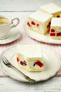 Lekkie, delikatne, szybkie i proste. Dwie warstwy biszkoptu przełożone bitą śmietaną i galaretką. Każdy smak i kolor galaretki pasuje do tego ciasta. Ja zdecydowałam się na czarną porzeczkę, truskawki, maliny i wiśnie. Wierzch ciasta można udekorować cukrem pudrem lub lukrem.