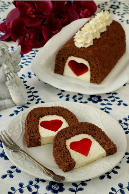 Walentynkowe ciasto last minut. Bardzo proste do przygotowania. Kakaowy biszkopt z dodatkiem masła, wypełniony śmietanową masą i galaretkowym sercem. Kolejne ciasto z serii łatwe i bardzo efektowne. Takie ciasta lubię najbardziej. Polecam bardzo serdecznie.