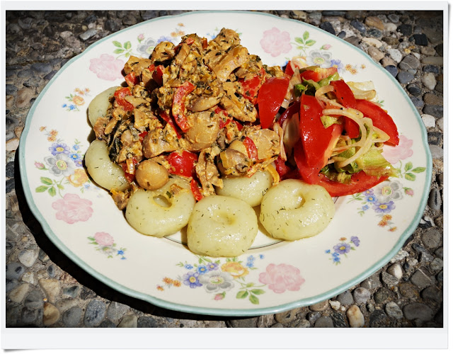 Kluski śląskie + sos paprykowo-pieczarkowy + pomidory z cebulą i porem.