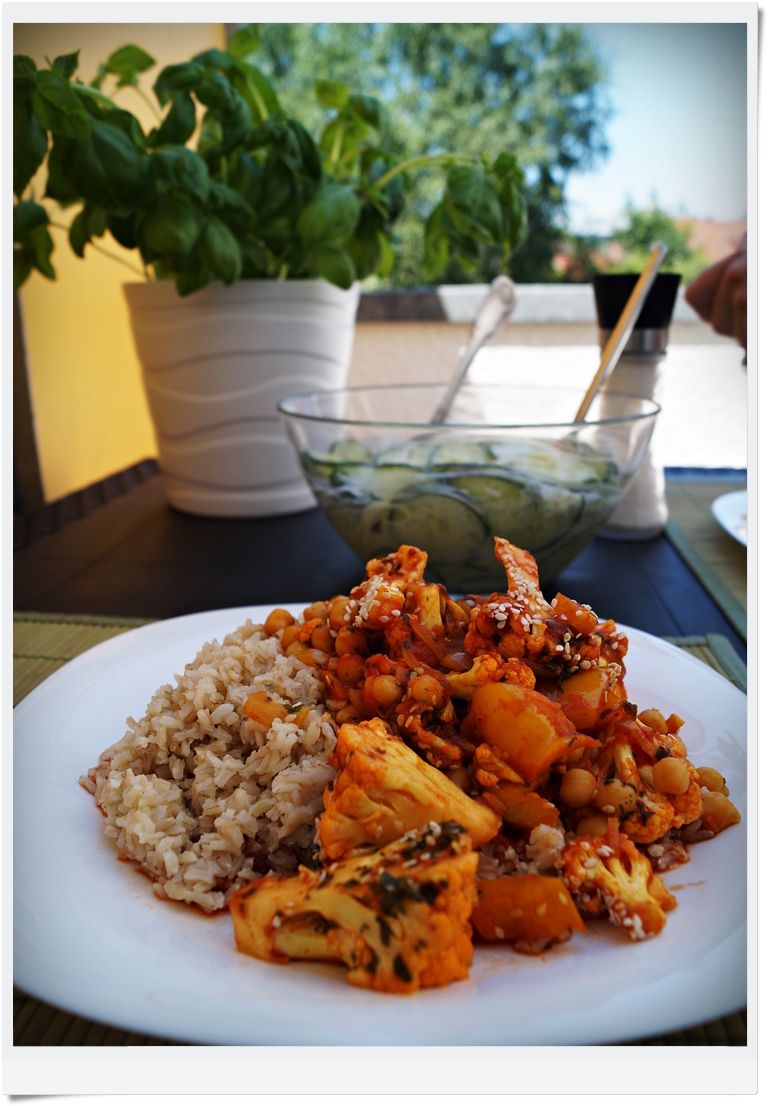 Słoneczny kalafior z ciecierzycą + kasza jęczmienna.