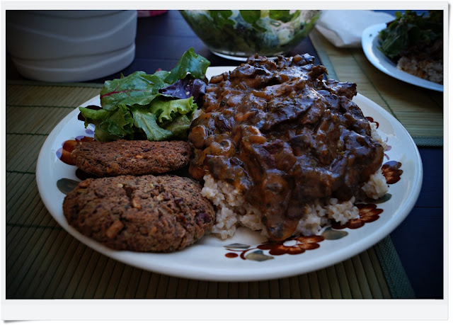 Kotlety z suszonego bobu (tak, tak suszonego, gdyż świeżego tutaj brak) + kasza jęczmienna + sos z suszonych grzybów (odkryliśmy jeszcze zapasy w szafce).