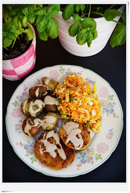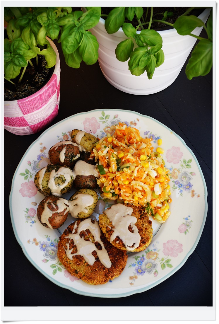 Młode ziemniaki + falafel + surówka z kapusty pekińskiej + sos tahini.