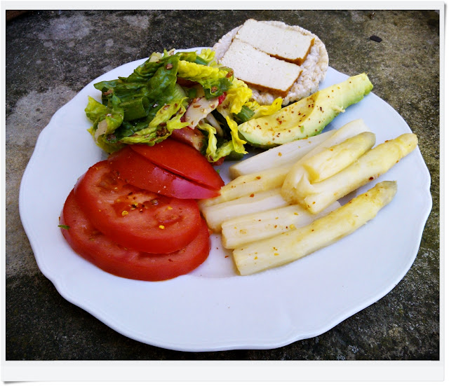 Szparagi + ryżowiec z wędzonym tofu + pomidor z zielenina.