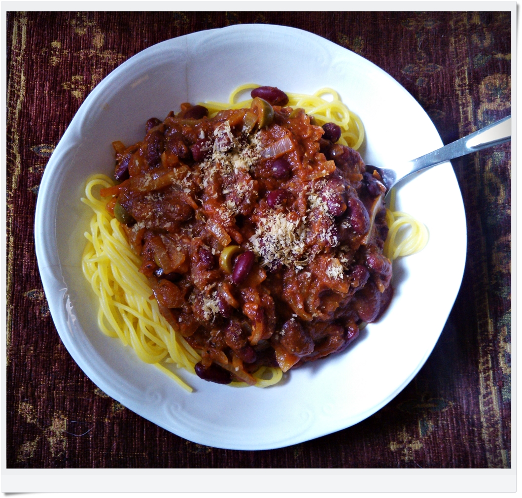 Spaghetti bezglutenowe + sos: fasola czerwona + pomidory + oliwki + cebula.