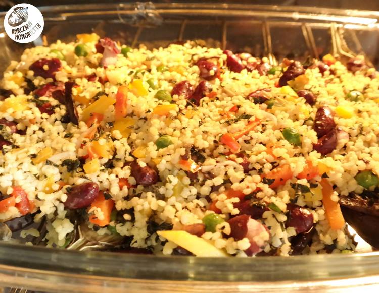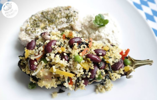 Teraz czas na farsz. Kaszę jaglaną ugotować al dente. Trochę ostudzić i dodać mieszankę. Jeśli była to mrożonka, to należy ją uprzednio rozmrozić, np wrzucając na patelnię z odrobiną oliwy i chwilę poddusić. Wymieszać wszystko z posiekaną miętą i pastą tahini. Nałożyć do bakłażanów i chwilę podpiec w piekarniku.
