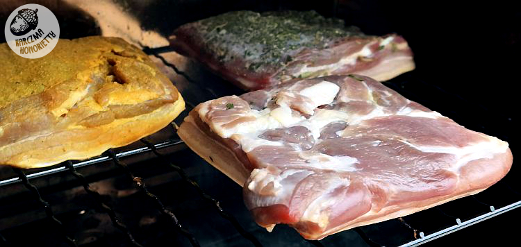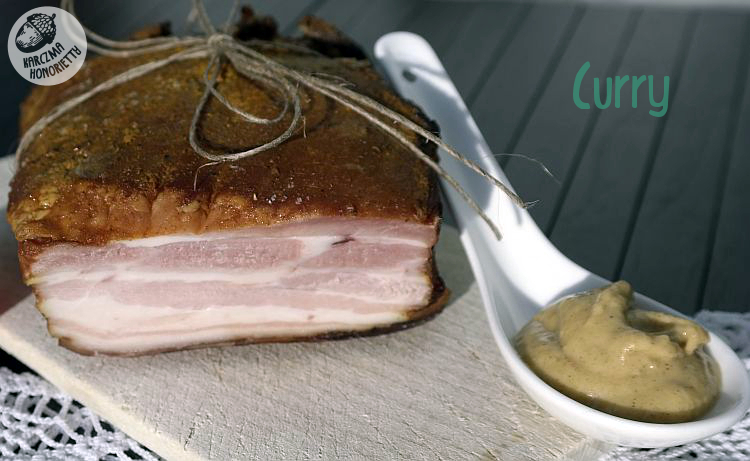 Każdy z kawałków boczku przemyć pod bieżącą wodą. Wytrzeć do sucha ręcznikami papierowymi. Sól wymieszać (jodowaną z peklosolą) i posolić każdą powierzchnię, tak jakbyśmy solili solniczką. Nie przesadzajmy. Następnie należy mięsiwku zapewnić odrobinę masażu, by mieć pewność, że sól jest już wszędzie. Jest to tzw. peklowanie na sucho. I teraz jeden kawałek boczku obtaczamy w majeranku i czosnku niedźwiedzim. Drugi obsypujemy curry. A trzeci pozostawiamy tylko posolony. Odstawiamy do lodówy na noc. Tym sposobem będziemy mieli trzy smaki za jednym wędzeniem.