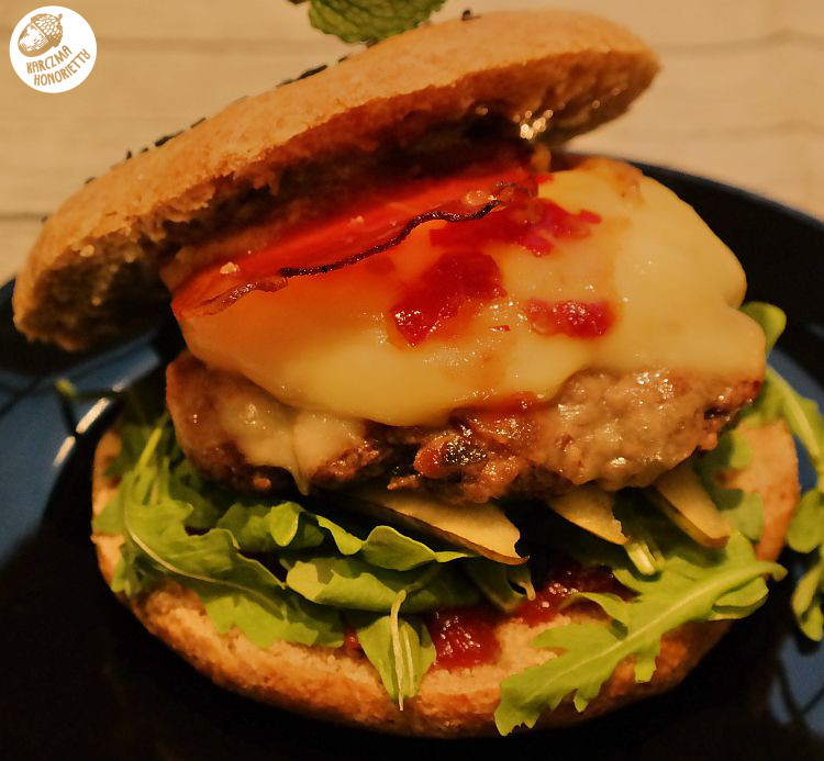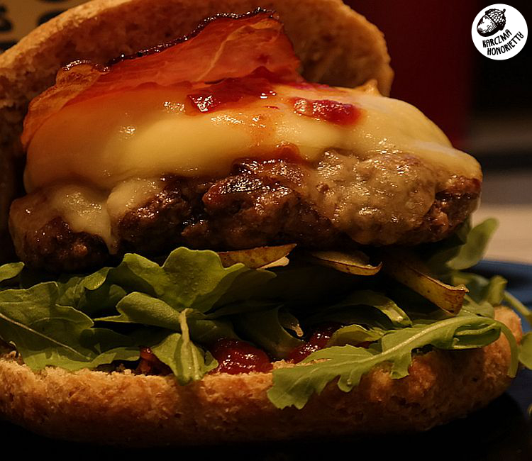 I tak jak widzicie na zdjęciu kombinacja smaków jest na prawdę dowolna. Poczynając od spodniej buły Hońka proponuje: chutney z czerwonej cebuli, rukolę, grillowaną gruszkę, grillowanego dosłownie przez chwilę pomidora i cebulę białą, kotleta wołowego, plaster Lazura Błękitnego, plaster Goudy, odrobinę pasty Sambal Oelec, plasterek upieczonej szynki długodojrzewającej np. parmeńskiej i ulubioną musztardkę.