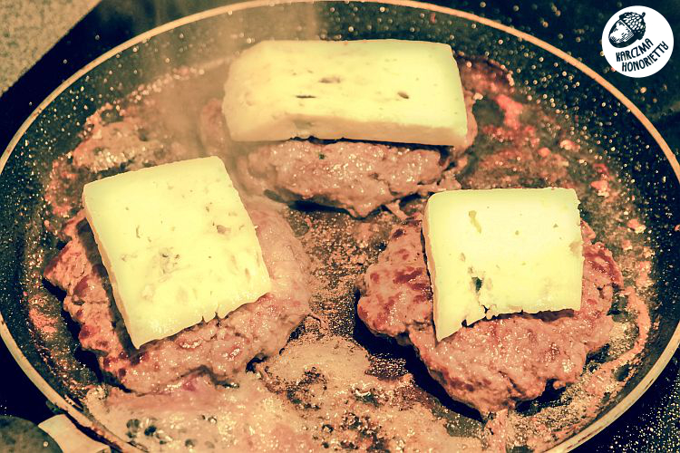 Czas smażenia kotletów, zależy od tego jakie lubimy. Określiłabym go na 3-7 minut z każdej strony. Im dłuższy czas smażenia/grillowania, tym bardziej wysmażony będzie kotlecior. Pod koniec smażenia kładziemy na nim ser. Hońka walnęła po plajstrze Błękitnego Lazura a następnie Goudy.