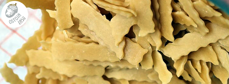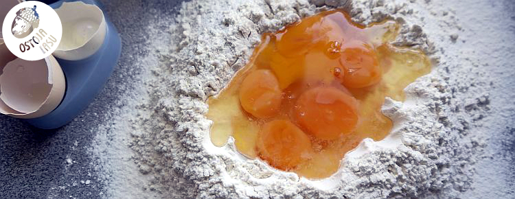 Przygotowanie:Mąkę przesiewamy i robimy w niej dołek, do którego wbijamy jajka. Wyrabiamy ciasto, dolewając stopniowo wody jeśli jest taka potrzeba. Dobrze odmierzyć sobie łyżką, bo może nie być potrzebna. Ciasto powinno być sprężyste. Zostawiamy je na jakieś 15 minut pod przykryciem, by nie wyschło.