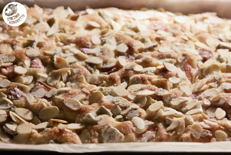Dużą blachę wyłożyć papierem do pieczenia. Wylać na nią wyrośnięte ciasto i rozprowadzić równomiernie. Piekarnik nagrzać do 180 stopni w trybie grzania dolnego. Rabarbar odcedzić/wycisnąć ( a syrop który powstał śmiało można wykorzystać jako napitek doobiadowy, czyli zalać wodą, dużą ilością wody - by był odpowiednio słodki ), posypać mąką i wymieszać. Tak obklejone kawałki rabarbaru układamy dociskając na cieście. Następnie całość obsypujemy płatkami migdałów i cukrem wanilinowym. Pieczemy z 25-30 minut, a następnie przestawiamy na grzanie z termoobiegiem by podpiekła nam się góra.
