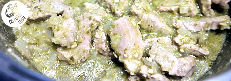 Teraz czas na wieprzowinkę. Będzie trochę szybciej. Polędwiczkę kroimy w mniejsze kawałki. Wrzucamy na patelnię. Dodajemy gotowe pesto (kupuję porcję świeżego, taką "na raz") i pokrojoną w kostkę cebulę. Przykrywam patelnię pokrywką i duszę całość z 10-15 minut, aż mięso będzie miękkie. Obiad gotowy: ) Smacznego!