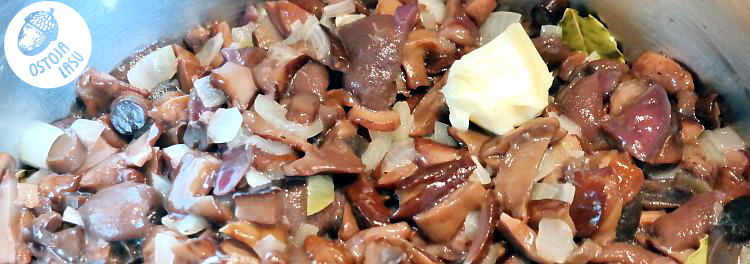 W garnku podsmażam cebulę pokrojoną w kostkę z przyprawami. Dodaję odcedzone grzyby. Przykrywam i zmniejszam ogień. Chwilę duszę z odrobiną masła.
