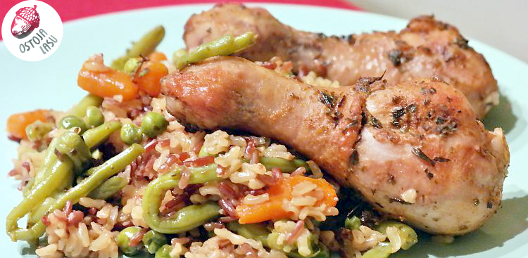 Kurczaka podsmażam na suchej patelni, ponieważ marynował się w oleju, aż do momentu przypieczenia z każdej strony. Uważajcie jednak by nie przypalić. Gdy uznacie, że już jest gotowy, to czas ułożyć go na ryżu i warzywach. Piekarnik nastawiam na 200 stopni, w trybie góra-dół. Do naczynia wlewam bulion, tak by znajdował się tuż pod kurczakiem i zapewnił możliwość ugotowania pozostałym składnikom. Piekę przez około 40 min, po czym zdejmuję pokrywę i przypiekam jeszcze kurczaka z 10-15 minut.