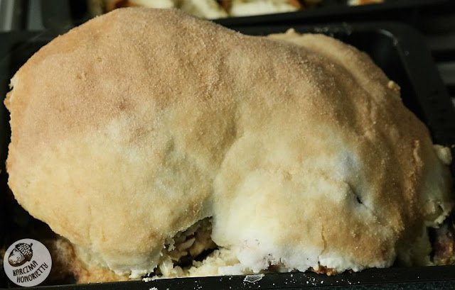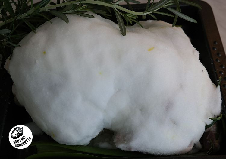 Białka jajka należy połączyć z solą (a z żółtek można sobie zrobić jajecznicę na śniadanie, bo czemu nie), by uzyskać masę o konsystencji plasteliny, którą oblepić nadzianego wcześniej kuraka, którego następnie umieszczamy w brytfance i pieczemy w piekarniku w ok. 200 stopniach przed godzinę - półtorej w zależności od wielkości kurczaka. Ten pieczony przeze mnie ważył 1,5kg.