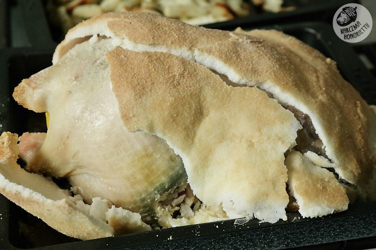 Masa solna pod wpływem temperatury utworzy twardą skorupę, po której kolorze będziemy wiedzieć, że czas wyłączyć piekarnik. Powinna się ze złocić/zbrązowieć. Po wyjęciu dajmy zwierzakowi odsapnąć z 10-15 minut i następnie rozbijmy solny pancerz. Najlepiej przy użyciu młotka lub czegoś równie solidnego. I nasz obiad gotowy.Mięso można skropić sokiem z cytryny, która piekła się w naszym kuraku. Proponuję podawać z aromatycznymi frytkami i chrupiącą mieszanką sałat z ulubionym dressingiem.