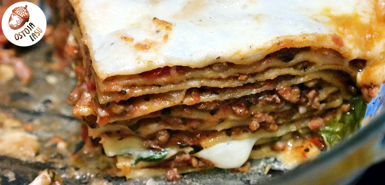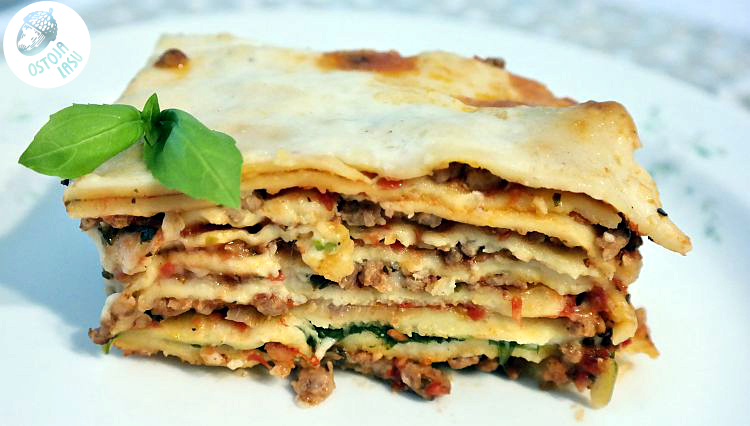 Teraz trzeba poskładać lazanię. Nagrzewam piekarnik do 200 stopni i zaczynam składać warstwy. Naczynie żaroodporne smaruję beszamelem i kładę pierwszy płat ciasta, na który nakładam trochę mięsa mielonego i przykrywam następnym makaronem. Smaruję znów beszamelem i tym razem wykładam szpinak, taki surowy i przykrywam kolejnym ciastem. I tak, aż skończą się składniki. Pamiętając by ostatnia warstwa z wierzchu została posmarowana beszamelem, na który ścieram parmezan.