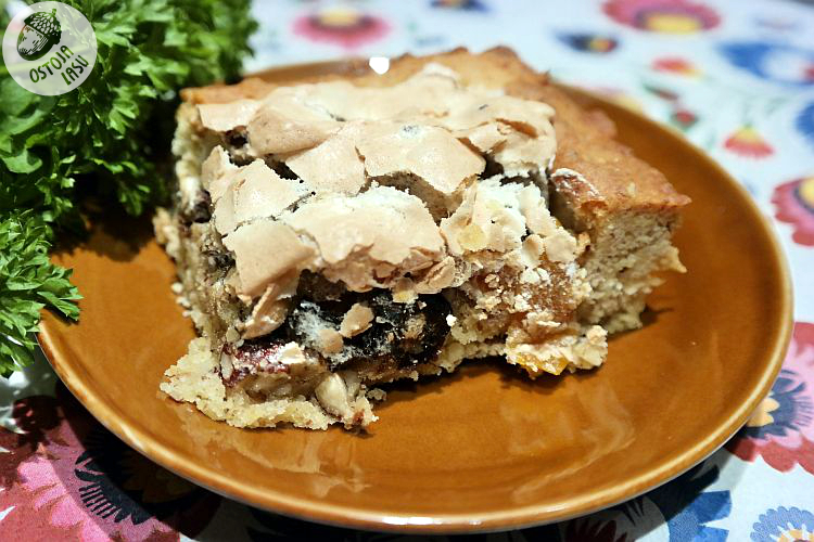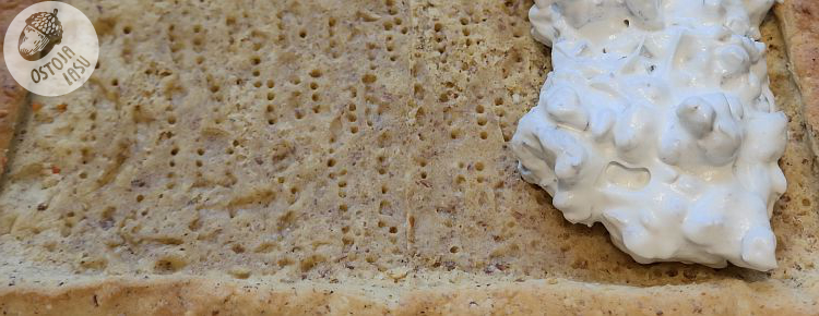 Tak przygotowane ciasto pieczemy 20-25 minut w uprzednio nagrzanym do 180 stopni piekarniku. Po tym czasie sprawdzamy stan dopieczenia. Zdejmujemy obciążenie i możemy ewentualnie dopiec do pożądanego koloru i chrupkości. Następnie odkładamy ciasto do wystygnięcia, a w tym czasie ubijamy pianę z białek ze szczyptą soli. W trakcie jej ubijania stopniowo dodajemy cukier, mąkę i sok z cytryny. Gdy piana będzie sztywna i lśniąca, odkładamy mikser i łączymy ją z uprzednio przygotowanymi bakaliami. Orzechy kroimy na mniejsze kawałki. Morele i śliwki również. Tak by nie połamać zębów :)