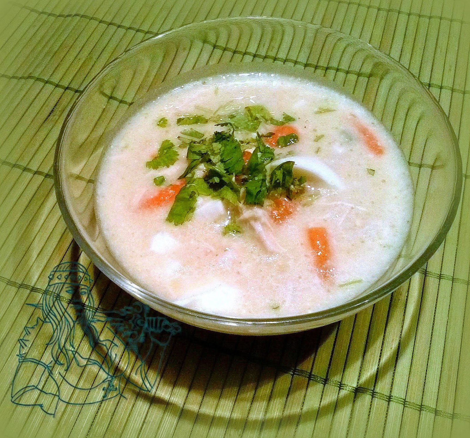 Bulion/wywar drobiowy przygotować wg swojego sposobu,ale używając zawczasu mięso drobiowe, które później wykorzystamy jako składnik zupy. Przecedzić wywar, by mieć ok 2 litrów płynu, mięso odłożyć do wystygnięcia, by było łatwiej pokroić je w kawałki. Odlewamy sobie szklankę bulionu, w której zmiksujemy migdały i żółtka z ugotowanych wcześniej jajek. Do bulionu wyciskamy czosnek i dodajemy mrożone mini marcheweczki. Gotujemy ok 10 min. Dolewamy zmiksowane migdały i kawałki kurczaka. Doprawiamy solą i pieprzem wg uznania oraz dodajemy pokrojone białko. Chwilę gotujemy. Gotową zupę, przelaną na talerz posypujemy świeżą kolendrą.