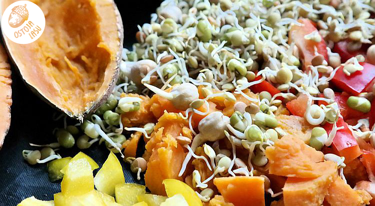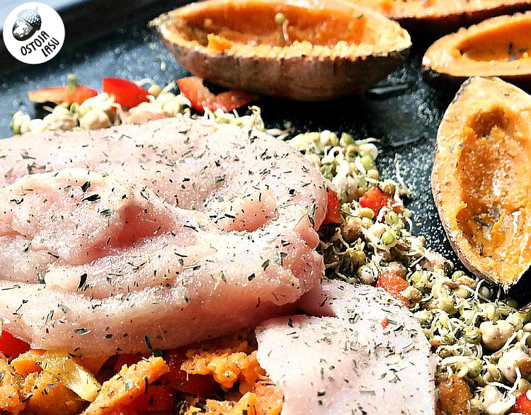 Przygotowanie:Dokładnie umyj bataty i nakłuj je widelcem dookoła. Teraz czas na chwilę czarów! Wkładamy je na 3-5 minut do mikrofalówki. Zależy jaką moc macie ustawioną. Gdy chwilę ostygną, przekrój na pół i wydrąż środek nadając im kształt małych łódeczek. Wybieraj bataty równej wielkości, nie za duże, licząc jednego na osobę. Przygotuj dużą blaszkę, którą lekko posmaruj olejem roślinnym lub wyłóż papierem do pieczenia. Połóż połówki batatów i wydrążone środki. Skrój po połowie obie papryki, na mniejsze kawałki. Dodaj mieszankę kiełków typu stir-fry. Oprósz odrobiną soli. Na wierzchu ułóż filet z kurczaka posypany suszonym oregano i estragonem. Na koniec całość skrop olejem roślinnym.