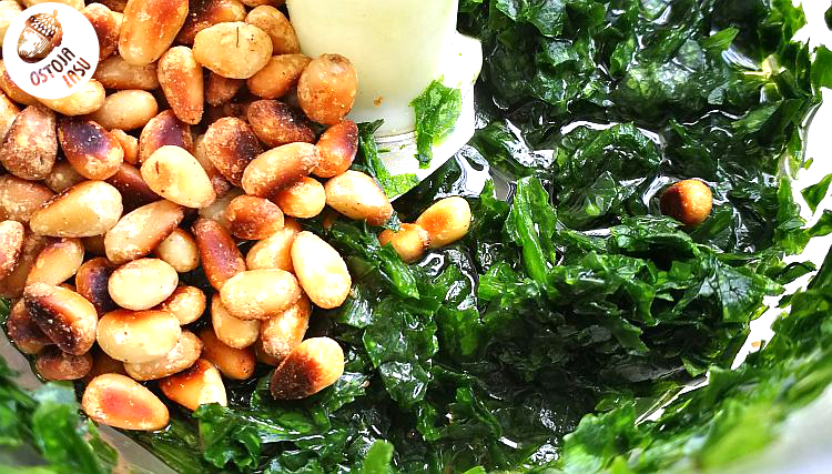 Umyty i osuszony czosnek, rwiemy na mniejsze kawałki i pozbywamy się łodyg. Wrzucamy do malaksera lub blendera kielichowego, dosypujemy podprażone na suchej patelni i ostudzone orzeszki piniowe. Dolewamy z 2 - 3 łyżki oleju bądź oliwy i miksujemy. Jeśli mamy i chcemy dodać sera, to też go tam wrzucamy. Ile? Proponowałabym łyżkę albo dwie uprzednio startego. I gotowe. Przekładamy do jakiegoś słoiczka lub zużywamy od razu. Taka porcja wystarczy na obiad dla 3-4 osób. Im więcej dodacie pesto do makaronu, tym będzie on intensywniejszy w smaku.