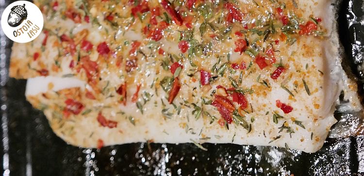 Halibuta przyprawiamy płatkami suszonego chili, pieprzem ziołowym oraz tymiankiem. Układamy go skórą do dołu, na posmarowaną odrobiną oleju roślinnego blaszkę. Dla większej wygody możemy położyć go na papierze do pieczenia. Wstawiamy do nagrzanego do 180 stopni piekarnika. Rybka nie potrzebuje zbyt wiele czasu. 10 - 15 minut wystarczy. Pod koniec możemy włączyć funkcję grilla. Jeśli sam szpinak i ryba to za mało na obiad, to śmiało do zielonego możemy dodać ugotowany makaron czy też ryż.