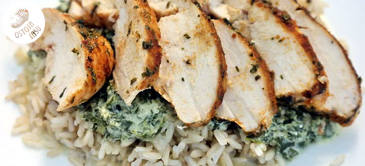 Przygotowanie:Filety przepłukać pod bieżącą wodą i oczyścić. Natrzeć olejem i przyprawić papryką, oregano, czosnkiem i posolić. Owinąć folią aluminiową, albo przełożyć do naczynia żaroodpornego. Piec w 200 - 220 stopniach przez 20 minut. W tym czasie ugotować ulubiony ryż. Natomiast na patelnię wrzucamy mrożony, poszatkowany szpinak. Czekamy, aż się rozmrozi i odparuje woda. Dodajemy ząbek czosnku przeciśnięty przez praskę. Solimy i podprawiamy jogurtem naturalnym. Jeśli jogurt naturalny wydaje się dla nas za kwaśny lub o zbyt rzadkiej konsystencji, to możemy użyć śmietany 12-18% lub nawet kremówki. Wykładamy ryż na talerz, przykrywamy szpinaczkiem i pokrojonym w plasterki kurczakiem.
