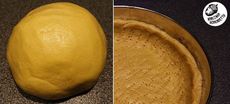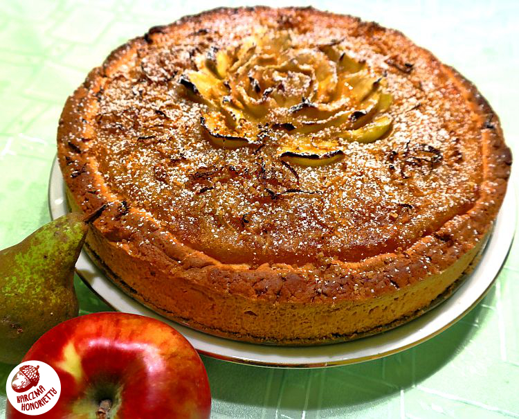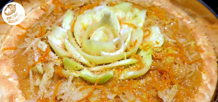 Wyłożyć ciasto do tortownicy. Nałożyć przestudzony kisiel jabłkowy (Karmelizowane jabłka podgrzać z cynamonem i mąką ziemniaczaną). Gruszkę obrać i ułożyć na górze w dowolnej formie. Posypać świeżo startymi skórkami z pomarańczy i cytryny. A następnie cukrem trzcinowym. Piec w 170 stopniach przez około 40 minut.