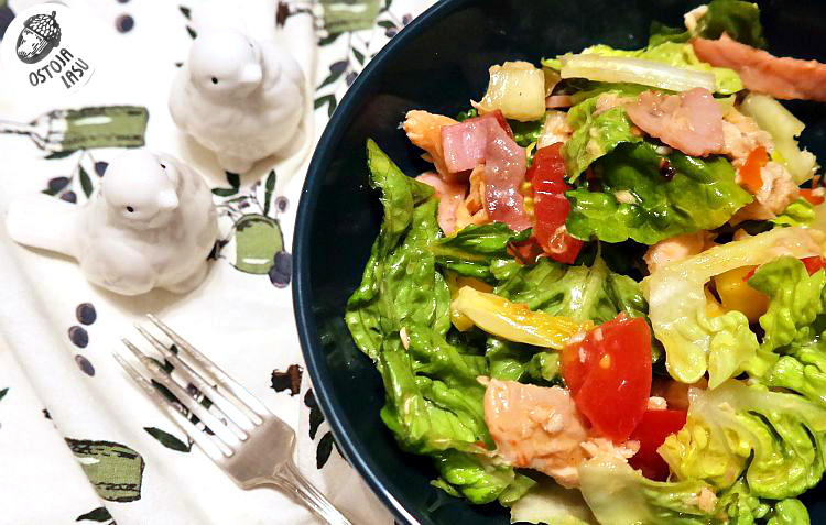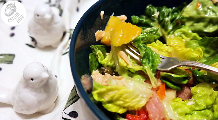Czas na sos. Ja mam zawsze pod ręką słoik, w którym mieszam wszystkie składniki do sosów sałatkowych. I także się stało w tym przypadku. Jako, że mam też słabość do oliw i olejów, to wykorzystałam ich kilka i powstała niezwykła mieszanka oleju rydzowego, lnianego i z oliwek. W końcu żyje się raz. Dokładnie mieszam sałatkę, by sos połączył wszystkie składniki razem.