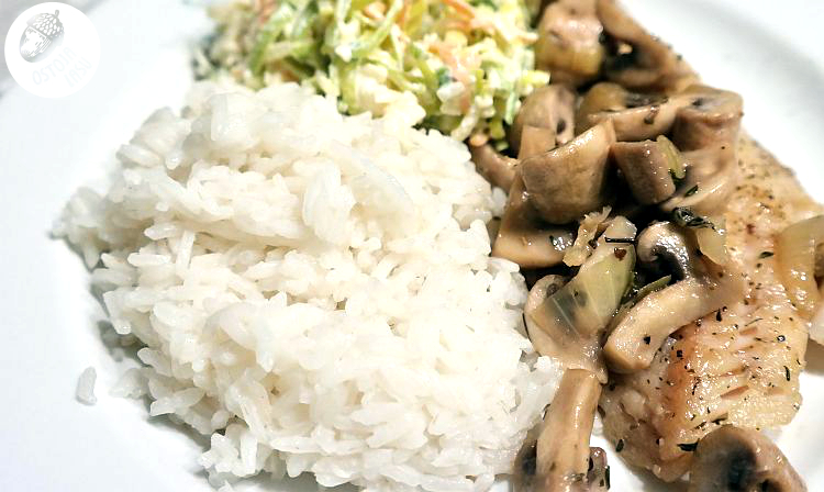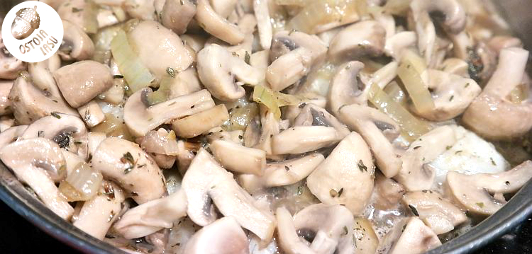 Przygotowanie:Filety z sandacza dokładnie osuszyć papierowym ręcznikiem kuchennym. Osolić i odstawić, aż sól wchłonie pozostałą wilgoć. Pieczarki umyć albo obrać i pokroić w talarki. Cebulę w kostkę i podsmażyć na odrobinie oleju roślinnego. Doprawić solą i pieprzem. Natomiast rybkę podsmażamy po ponownym jej osuszeniu ręcznikiem i oprószeniu tymiankiem i pieprzem.
