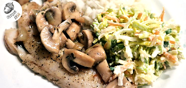 Ryba nie musi być długo smażona, ponieważ teraz dodamy do niej podduszone pieczarki z cebulą i tak razem będą się jeszcze dusić, aż do przeniknięcia smaków z 10-15 minut, na małym ogniu. Smacznego!