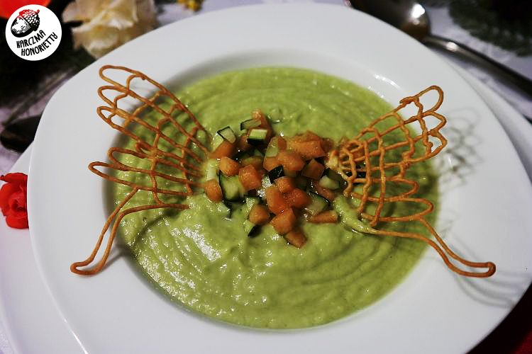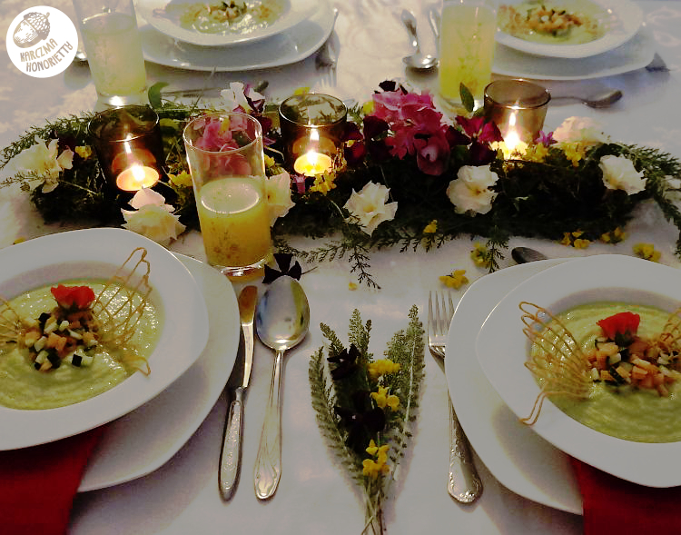 OCZAROWANIE UKOCHANEGO/SPORZĄDZENIE ZUPYZaczynamy od ogórków. Dwa duże odkładamy, a resztę obieramy ze skórki, pozbawiamy i kroimy w mniejsze kawałki. Obieramy awokado, wyjmujemy pestkę, i miksujemy z ogórkami przy pomocy miksera ręcznego