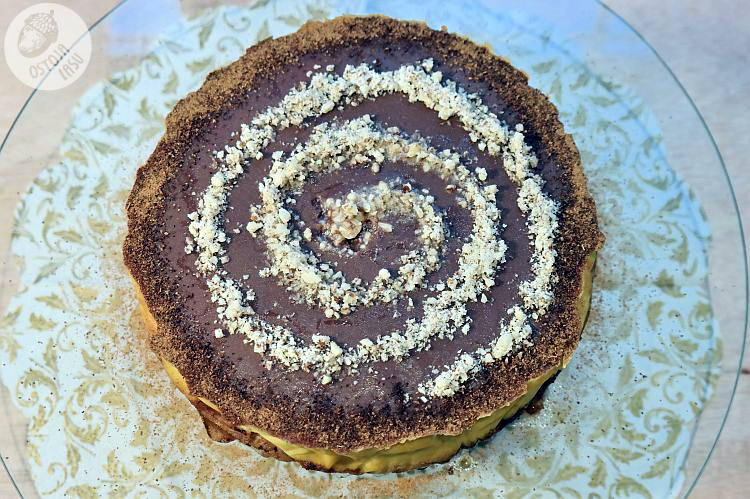Wyjmujemy z tortownicy i polewamy wierzch rozpuszczoną czekoladą i dekorujemy mielonymi orzechami i kakao.