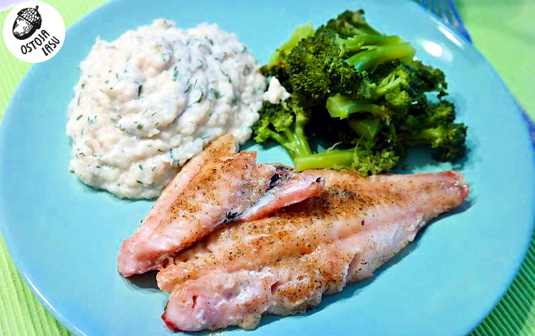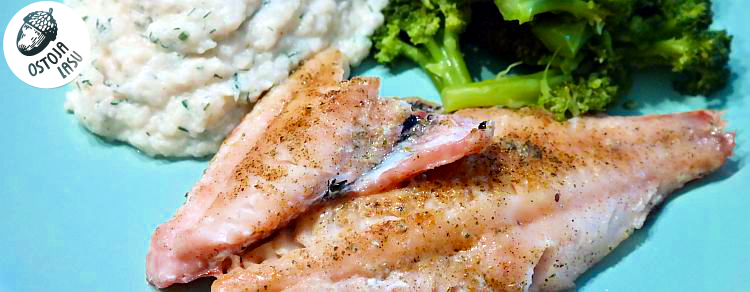 Rybę osuszam papierowym ręcznikiem kuchennym,a następnie solę i zostawiam w spokoju na jakieś 15-20 minut. Po czym ponownie osuszam papierowym ręcznikiem. Jestem zdania, że dobra ryba nie potrzebuje wymyślnych przypraw i grubej panierki, panierki żadnej w sumie. Doprawiam pieprzem i smażę. Taki filecik nie potrzebuje zbyt wiele czasu, w przeciwieństwie do ugotowania surowego brokuła. Oczywiście możecie go zastąpić dowolnym dodatkiem lub surówką, którą lubicie podawać z rybą.