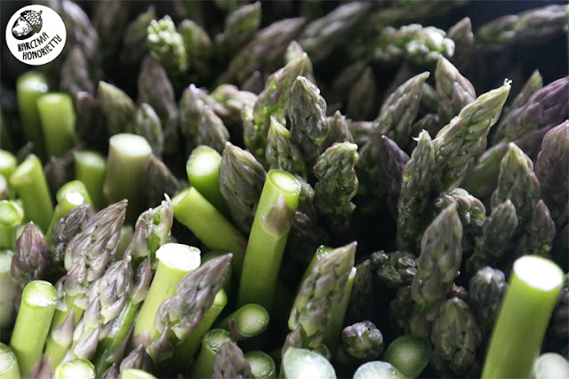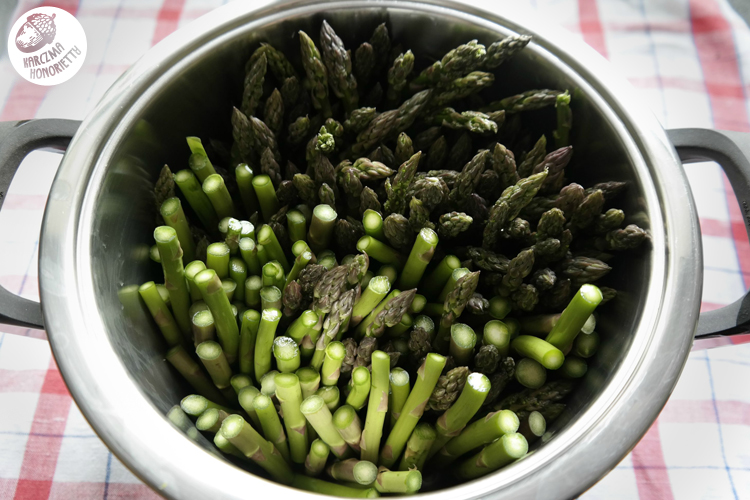 Szparagi gotujemy tak, jak to widać na zdjęciu poniżej. Główki powinny wystawać ponad poziom wody, gdyż potrzebują znacznie mniej czasu. Średnio można założyć, że cienkie szparagi potrzebują 3-5 minut. Jak widać nie posiadam specjalnego gara do gotowania ich, tak samo jak nie posiadam gara do gotowania spaghetti. Kto by pomieścił w kuchni wszystkie te klamoty. Nie bądźmy zbyt dosłowni. Radźmy sobie z tym co mamy. Jako, że moje szparagi były długie i cienkie, to podzieliłam je na pół. Nie obierałam. Umyłam i wsadziłam do garnka. Upchałam by stały prosto, a do jedzenia przeznaczyłam tylko te części z "kwiatkiem".