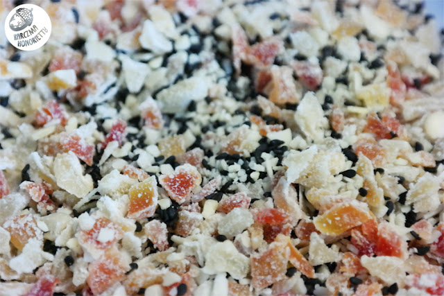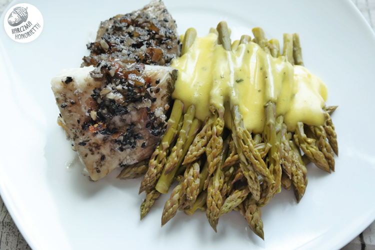Oczywiście, że można jeść same szparagi, tylko po co? Zatem może rybka? Najlepiej morska! Nadarzyła się okazja na halibuta. Rybę należy osuszyć ręcznikiem i posolić przynajmniej z godzinę przed przyrządzaniem. Sól musi mieć czas by zadziałać higroskopijnie. Następnie Hońka umyśliła sobie, że można by zaszaleć z "panierką". Zatem pokroiła kandyzowane owoce tropikalne (papaja, ananas, mango) i dodała do pokruszonych migdałów w płatkach i ziaren czarnego sezamu (bo taki miała, ale tu uwaga - biały sprawdzi się lepiej, bo pod wpływem ciepła nie puści koloru). I w takiej to panierce obtaczam spryskanego sokiem z cytryny halibuta i smażę na rozgrzanej patelni z odrobiną, dosłownie odrobiną oleju roślinnego (3-5 min na każdą stronę, w zależności od grubości porcji).