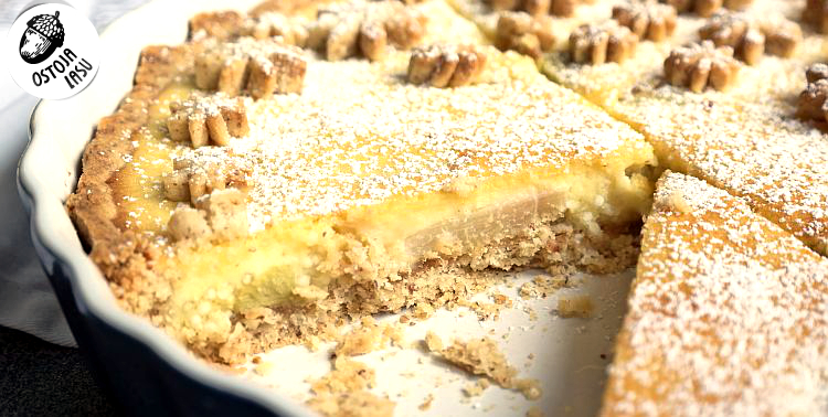 Piekę z 30 minut również w temperaturze 180 stopni. Po czym wyciągam i dekoruję pozostałą częścią ciasta. Dopiekam przez 15 minut. Wyjmuję z piekarnika do ostudzenia i dopiero wtedy mogę z łatwością kroić je na kawałki. Można całość posypać cukrem pudrem. Pysznie komponuje się z kwaskowym sorbetem.