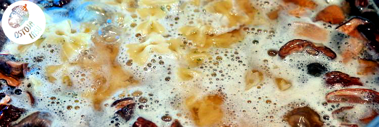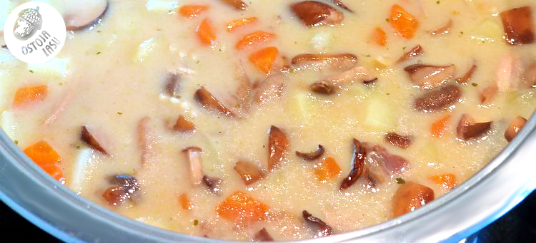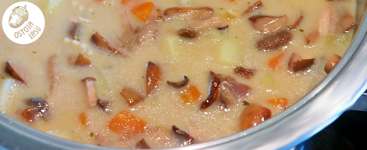 Przygotowanie:Grzyby czyścimy i kroimy na drobniejsze kawałki. Obgotowuję je jeden raz w osolonej wodzie. Odcedzam. Ziemniaki kroję w kostkę i gotuję osobno. Makaron można gotować bezpośrednio w zupie, z zaznaczaniem że zjemy ją "za jednym podejściem" (makaron dłużej przebywający w cieczy pęcznieje i następnego dnia przy odgrzewaniu zastaniemy makaron z sosem zamiast zupy).