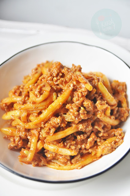 Na początku chciałam ugotować coś zupełnie innego. W międzyczasie (jak to u mnie) postanowiłam coś pozmieniać i skończyło się tym przepisem. No i fajnie. Potrawa smakuje trochę jak bolognese, więc na pewno znajdzie wielu zwolenników. I jak zwykle, przy okazji tego typu dań, smakuje lepiej parę godzin po zrobieniu.