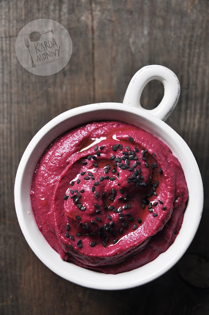 Ciecierzycę zalewamy zimną wodą i odstawiamy na całą noc (dwukrotnie zwiększy swoją objętość). Po tym czasie wymieniamy w ciecierzycy wodę i gotujemy ją do miękkości, przecedzamy i studzimy. Buraki zawijamy w folię aluminiową i pieczemy w 180 stopniach ok. godziny, także studzimy. Obrane buraki wrzucamy do blendera razem z ciecierzycą i resztą składników. Jeżeli pasta jest za gęsta, można do niej dodać trochę zimnej wody. Przed podaniem można ją posypać sezamem, świeżym tymiankiem, polać oliwą, co Wam tylko wpadnie do głowy.