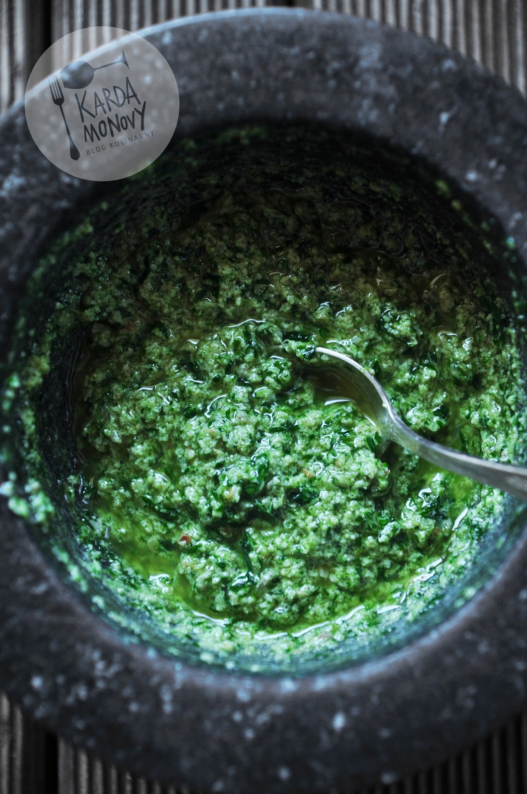 Pestki dyni prażymy do zrumienienia na suchej patelni, studzimy. Do moździerza wrzucamy sól, czosnek, rzeżuchę i natkę, wszystko rozdrabniamy (jeżeli nie macie moździerza, wrzućcie wszystkie składniki do blendera i zmiksujcie). Do całości dolewamy oliwę i sok z cytryny, dodajemy świeżo zmielony pieprz, mieszamy.