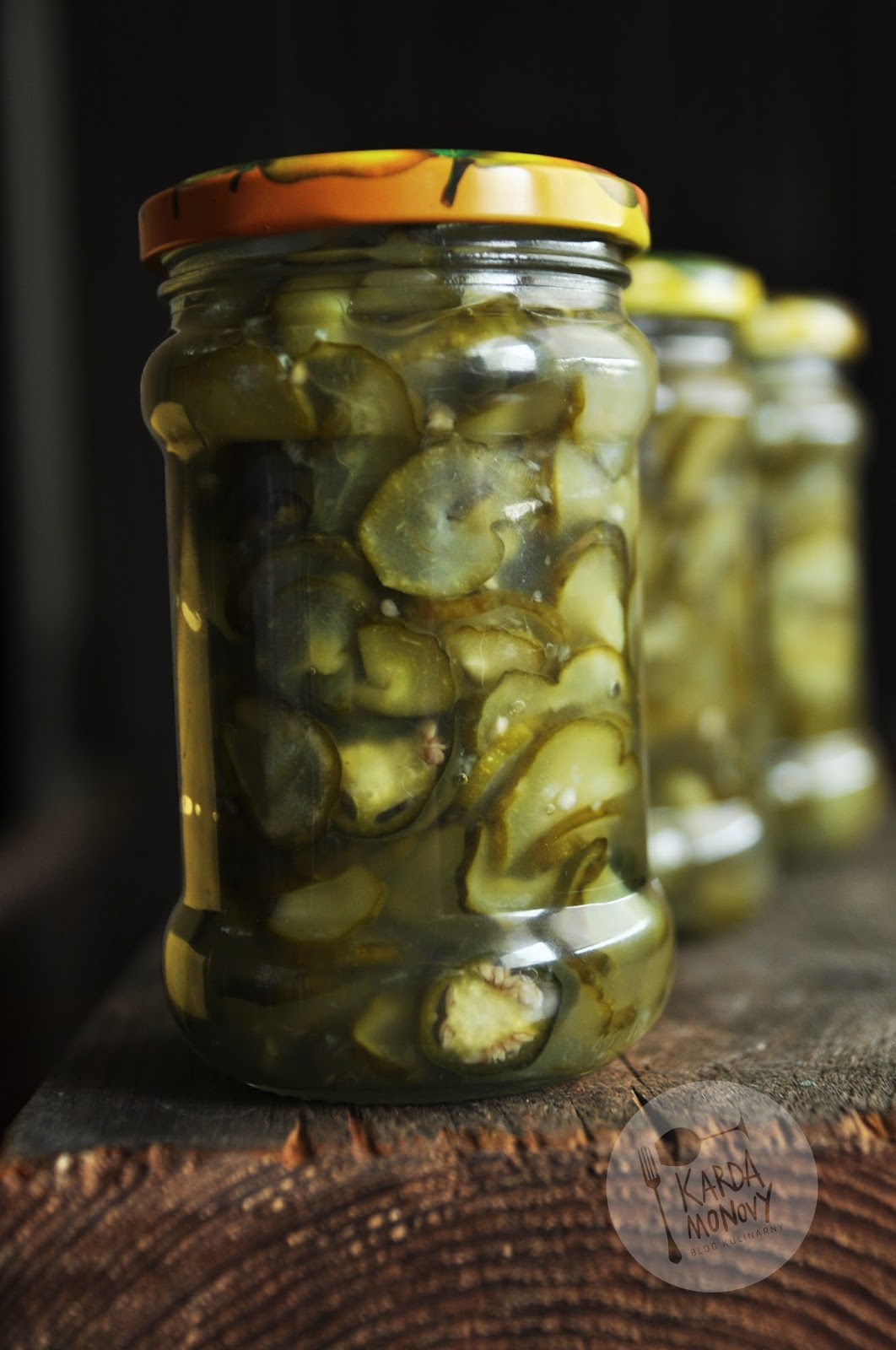 Ogórki bardzo dokładnie szorujemy i kroimy w cienkie plasterki. Zasypujemy solą i odstawiamy na 3 godziny. Po tym czasie wyciskamy z nich wodę, nie będzie nam potrzebna. Z octu, wody, cukru, ziela angielskiego i liści laurowych robimy zalewę - wszystko pakujemy do garnka i gotujemy jakieś 2 minuty. Do ogórków dorzucamy pokrojone w piórka cebule, rozdrobniony czosnek, pokrojone w plasterki jalapeno i odcedzoną zalewę, całość odstawiamy na 12 godzin. Pamiętajcie żeby od czasu do czasu przemieszać ogórki. Na tym etapie można je jeszcze doprawić solą. Do wyparzonych słoików, ściśle wkładamy ogórki, uzupełniając je zalewą i zamykamy wyparzonymi zakrętkami. Pasteryzujemy.