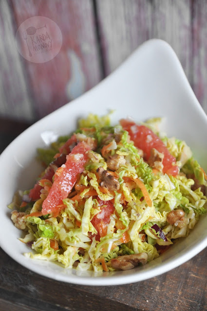 Skórę z grejpfruta obieramy nożem w taki sposób, aby nie pozostało na nim białych błon. Później go filetujemy - wycinamy kawałki owoców między błonami. Z reszty owocu wyciskamy sok do szklanki (do sosu będzie nam potrzebna 1 łyżka, resztę można wypić). Kapustę obieramy z brzydkich zewnętrznych liści, myjemy i cienko szatkujemy, wrzucamy do miski. Dodajemy do niej pokrojoną w drobną kostkę cebulę, kawałki grejpfruta i startą na grubych oczkach marchewkę. Do małego słoiczka wlewamy oliwę, sok z grejpfruta, dokładamy musztardę i rozdrobniony ząbek czosnku, zamykamy i energicznie mieszamy. Sałatkę polewamy sosem, doprawiamy, dokładnie mieszamy. Posypujemy orzechami.