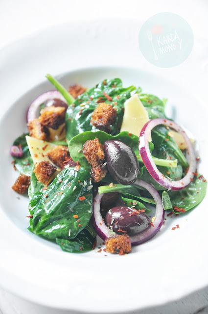 Kromki kroimy w kostkę, skrapiamy odrobiną oliwy i opiekamy w piekarniku w 180 stopniach około 10 minut. Szpinak dokładnie myjemy i osuszamy, wrzucamy do miski. Dodajemy do niego oliwki, pokrojone w plasterki cebulę i ser, grzanki, łyżkę oliwy, sok z cytryny, przyprawy. Dokładnie mieszamy.