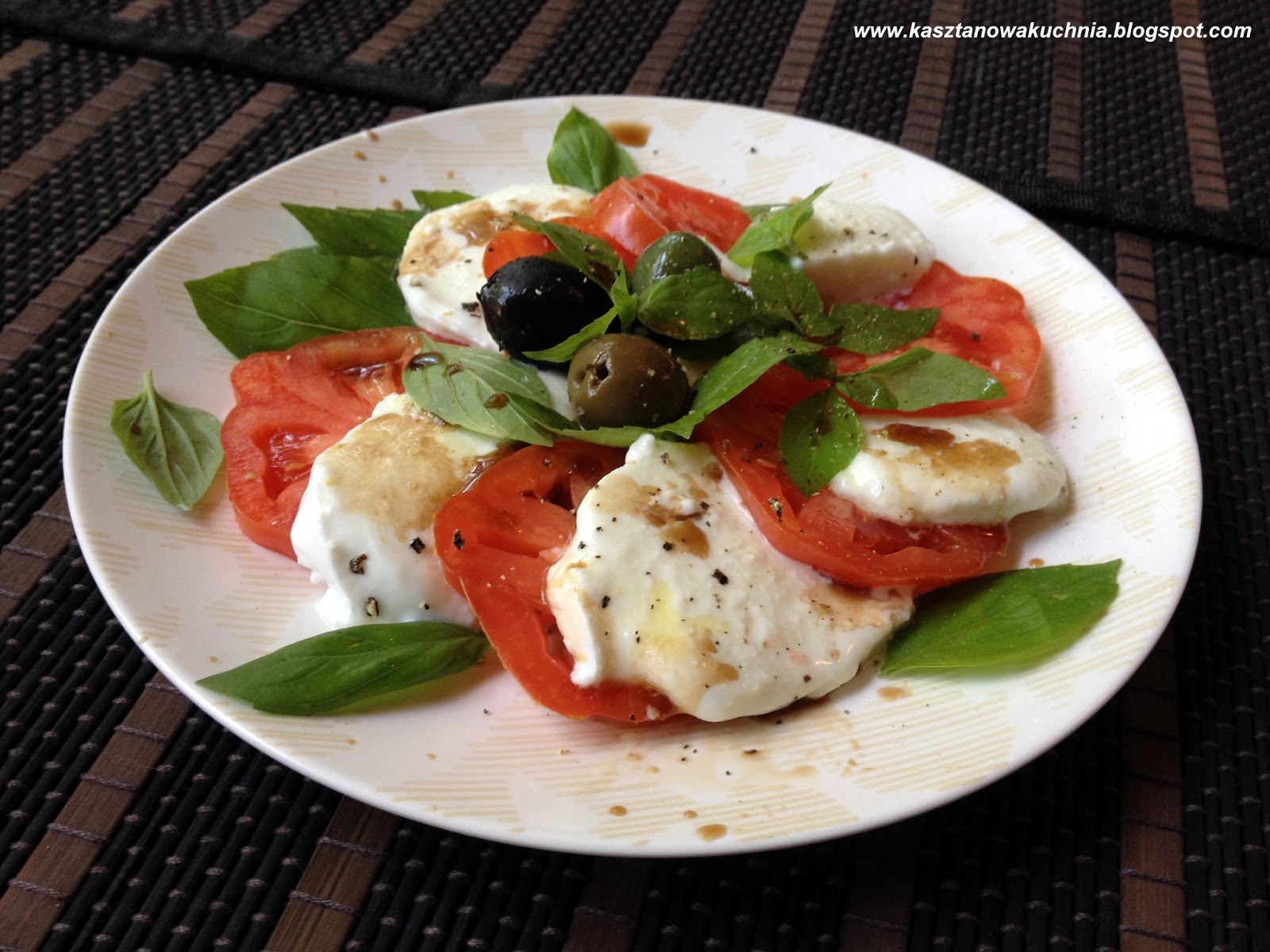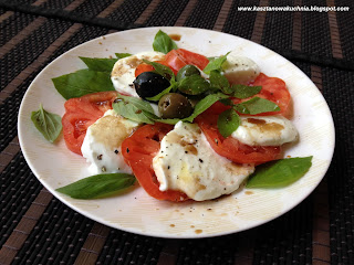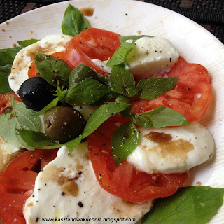 Wykonanie jest bardzo proste: plastry sera i pomidora przekładamy z listkami bazylii. Można skropić oliwą z oliwek i octem balsamicznym oraz lekko posypać solą i pieprzem =)
