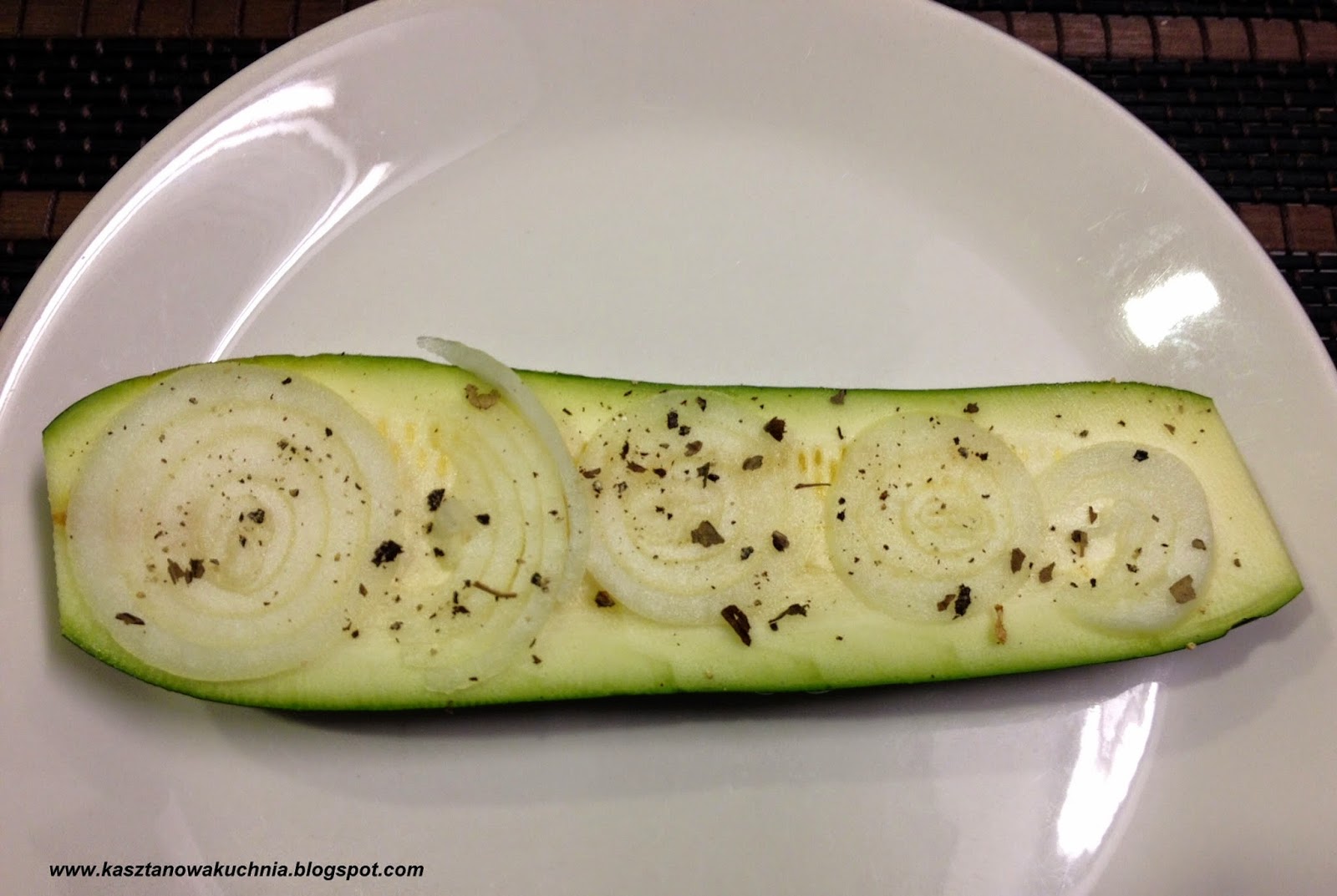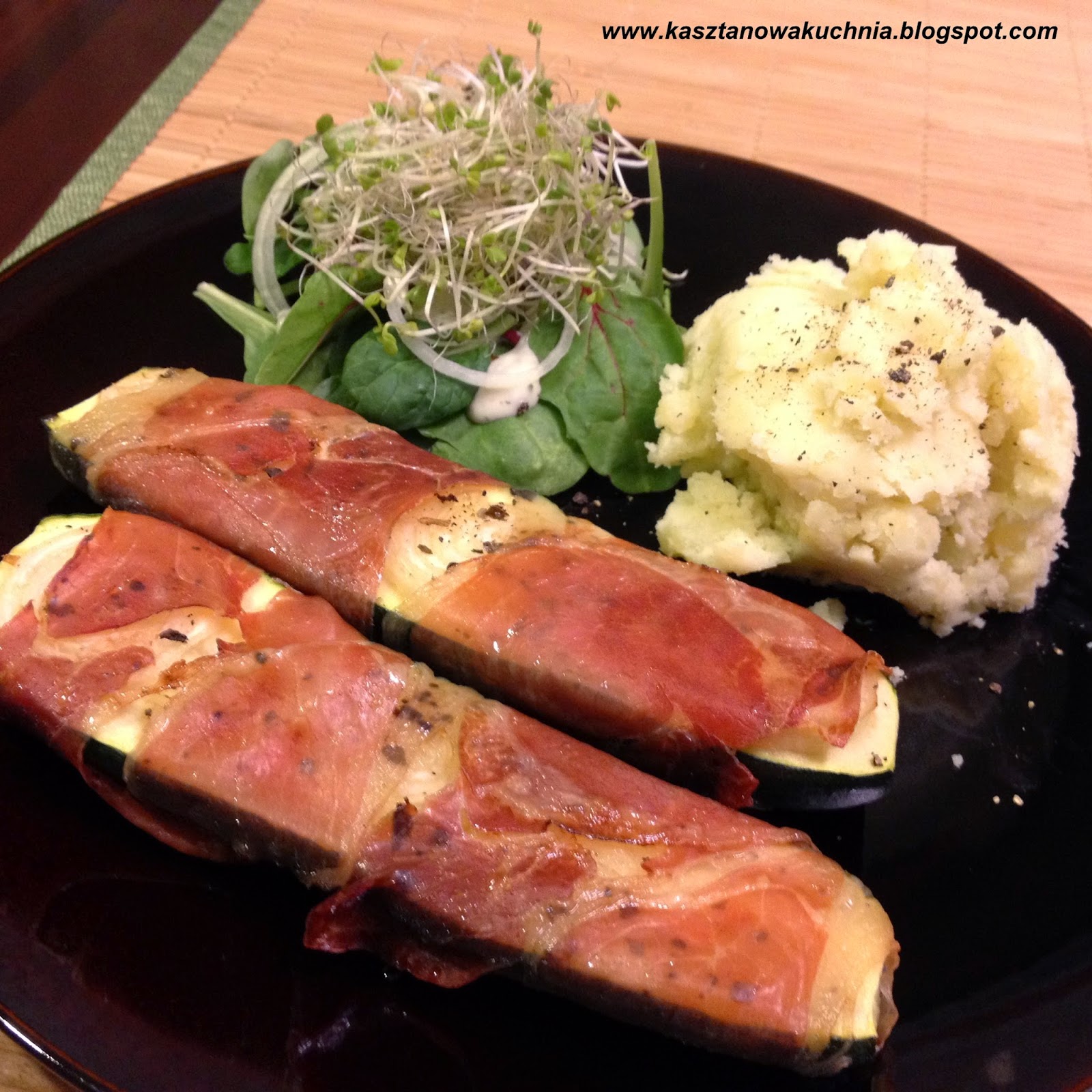 Cześć =) Zbliża się sezon letni, kiedy stragany będą obfitować w cukinie i kabaczki, a ich miłośnicy szukać nowych i ciekawych sposobów na przyrządzenie tych warzyw. W tym duchu Kasztanowa Kuchnia zaprasza na cukinię zapieczoną z plastrami aromatycznej szynki dojrzewającej. Można użyć dowolnej szynki tego typu, np. bawarskiej, parmeńskiej, prosciutto, serrano, czy, jak w tym przypadku, wersji francuskiej: jambon de Bayonne. Dodatkiem smakowym do cukinii jest tu cebula oraz dowolne zioła, najlepiej oczywiście świeże. Zamiast cukinii można użyć bardzo podobne do niej żółte kabaczki =)