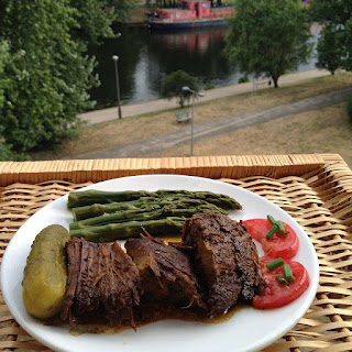 Podczas ostatniej wizyty u babci Krysi, babcia podała pieczoną szynkę wieprzową, w towarzystwie zielonych szparagów, ogórka kiszonego i pomidora.