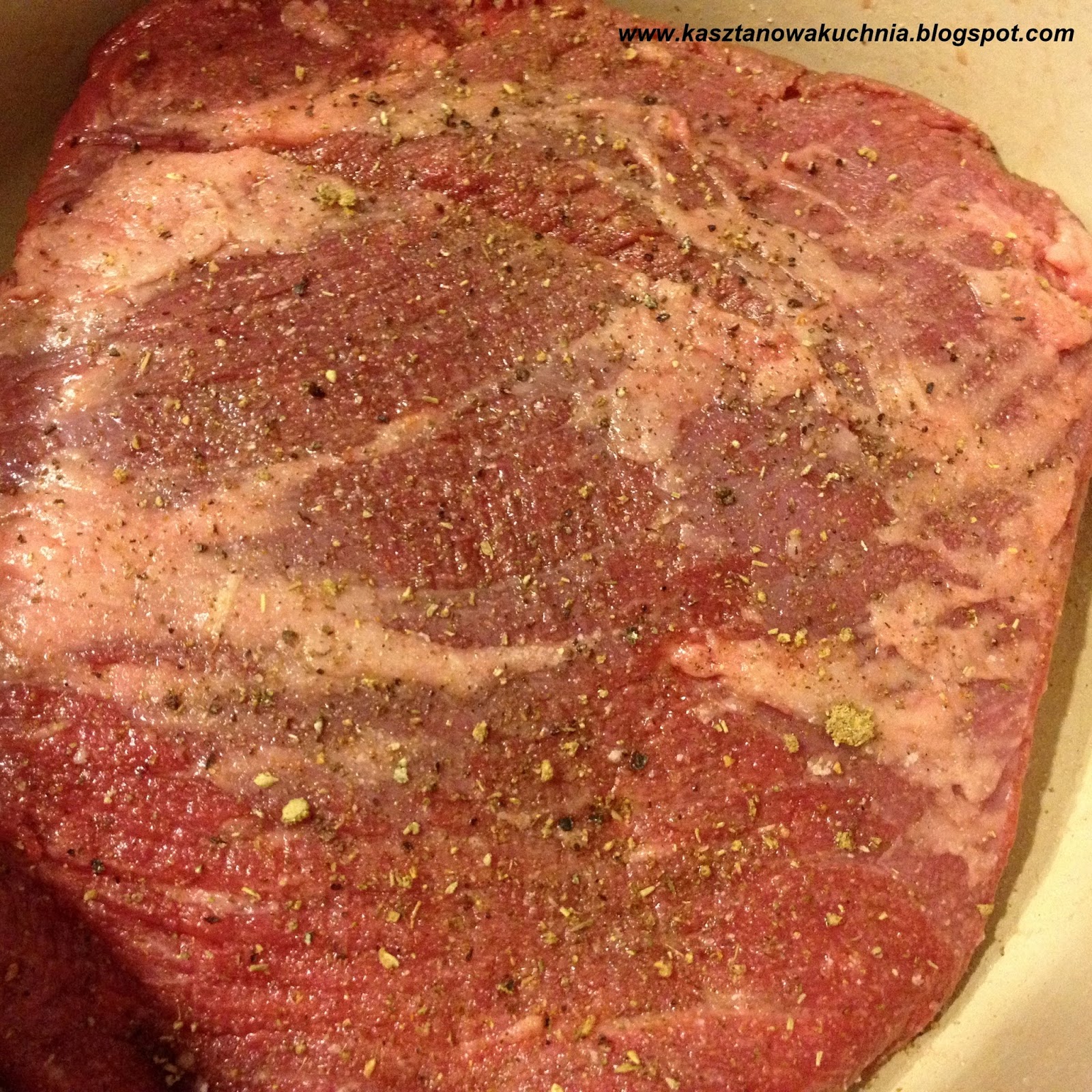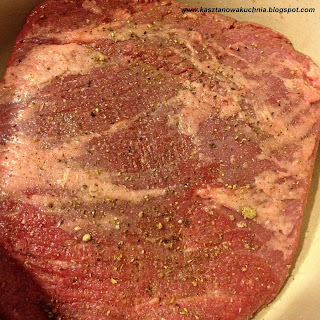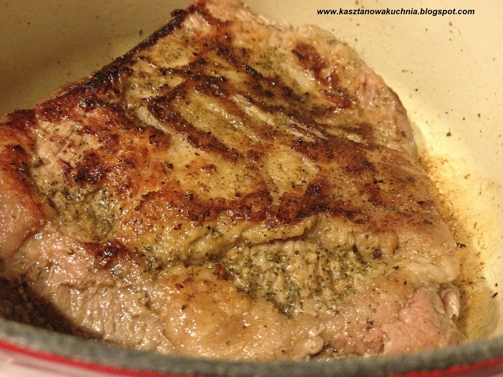 2) Mięso przyprawiamy obficie solą, pieprzem i ziołami, wkładamy do garnka (lub głębokiej patelni), w którym będzie się dusiło stroną tłuszczowa do dołu i zostawiamy w przyprawach na całą noc, albo przynajmniej na kilka godzin.