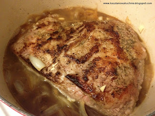3) Przed duszeniem trzymamy garnek z mięsem w temperaturze pokojowej ok. godziny. Następnie stawiamy garnek na gazie i obsmażamy mięso na złocisto-brunatny kolor z każdej strony, po ok. 5 minut. Obsmażanie zaczynamy od strony mięsa pokrytej tłuszczem, więc nie potrzeba już dodatkowego tłuszczu do smażenia.